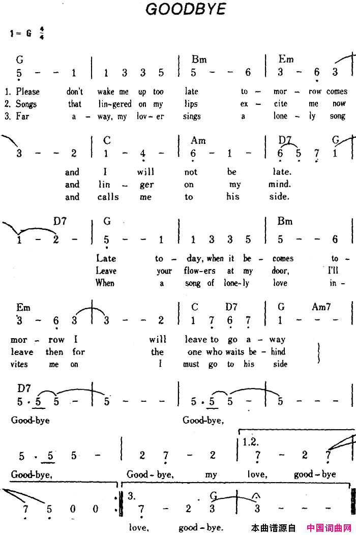 点击页面上方免费下载和打印 [美]Goodbye再见简谱曲谱,即可免费下载和打印本曲谱全部内容简谱是音乐的密码本,音符是跳动的心电图。简谱之家帮助每个热爱音乐的人学习乐器