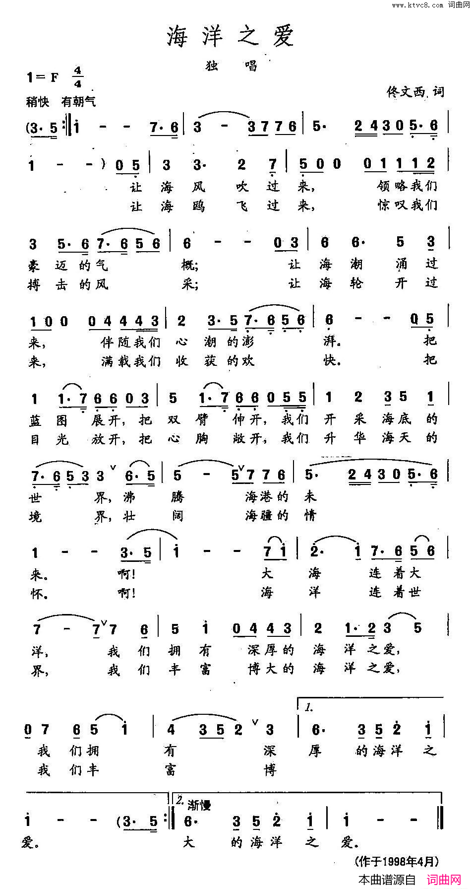 点击页面上方免费下载和打印 田光歌曲选_218海洋之爱简谱曲谱,即可免费下载和打印本曲谱全部内容简谱是音乐的密码本,音符是跳动的心电图。简谱之家帮助每个热爱音乐的人学习乐器