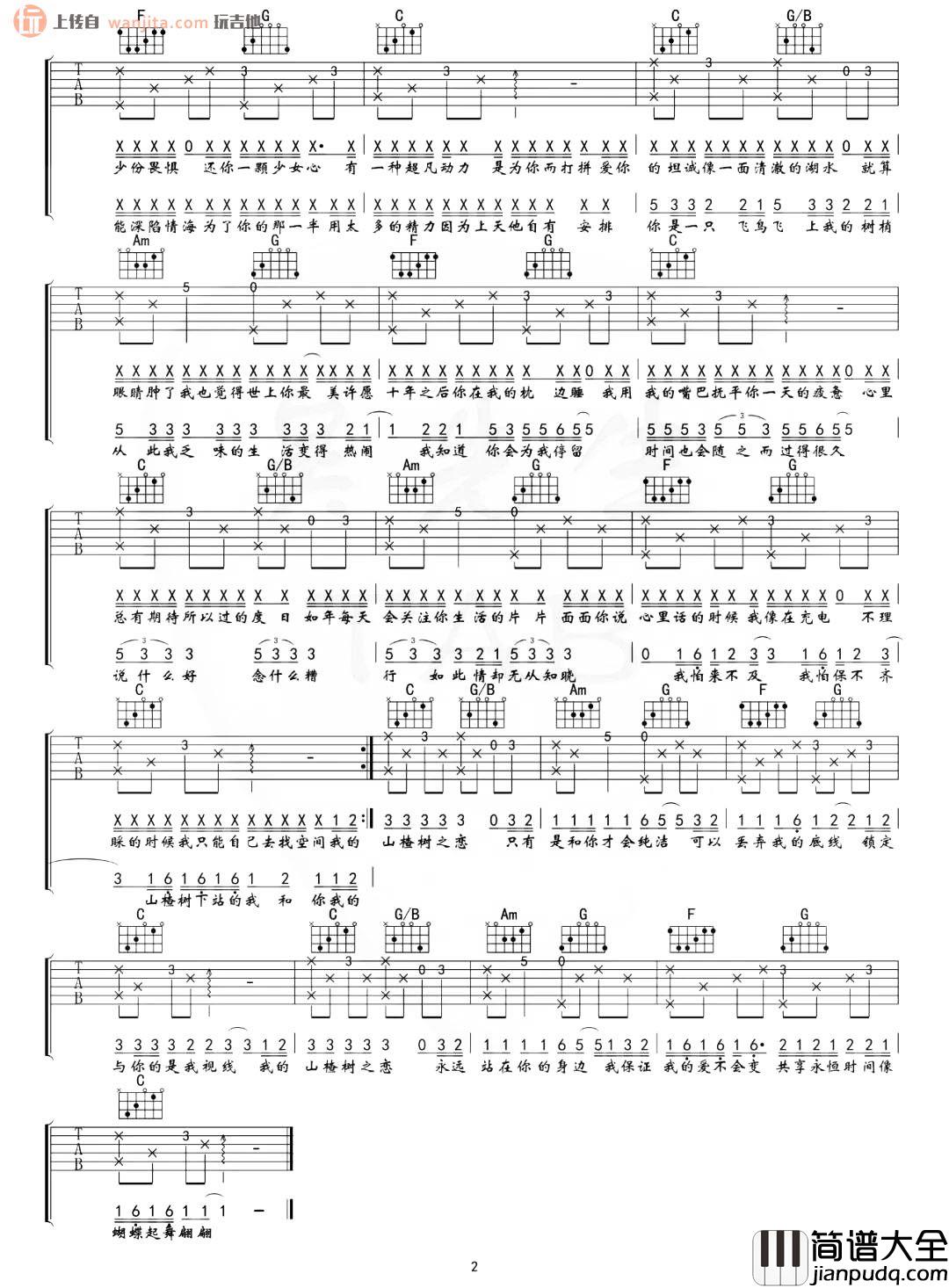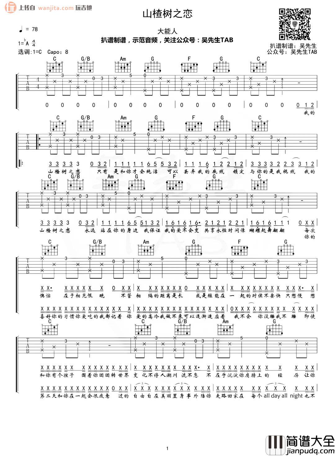 山楂树之恋吉他谱,一首清澈而纯真的情歌。选用C调指法,变调夹Capo夹8品弹唱原调,建议不用夹那么高把位,根据自己音域进行适度上调,弹唱和弦基本上和原版一致,总共2张高清图片谱,感谢吴先生的制谱编配,玩吉他整理上传。